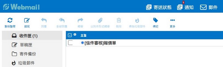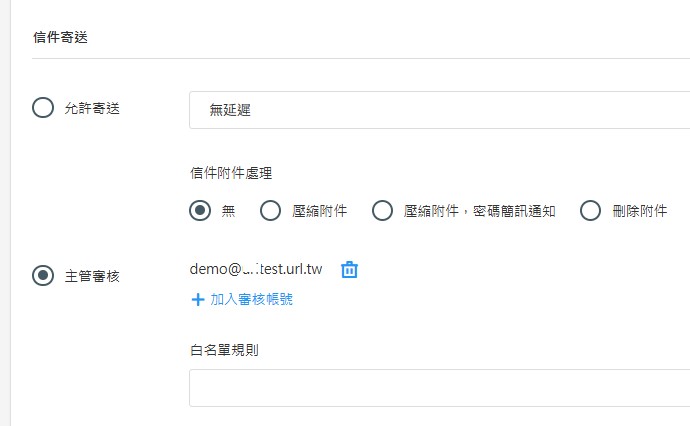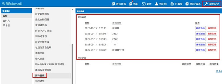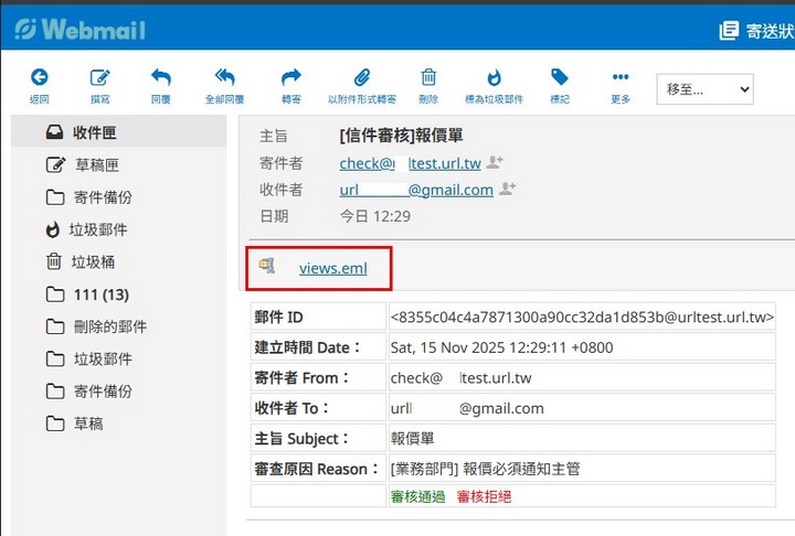 管理者操作介面的郵件郵件稽核郵件稽核 建立稽核規則 主管審核流程及觀看原信件 ❶當有設定"主管審核"時。 ❷主管信箱在Webmail中,可收到審核信件通知。 並可點開該信件,信件中的附檔下載後點開,可看到原始信件內容。 ❸也可到:環境設定→郵件審核,查詢目前待審核信件,及是否審核通過。。