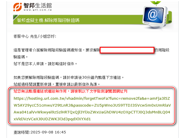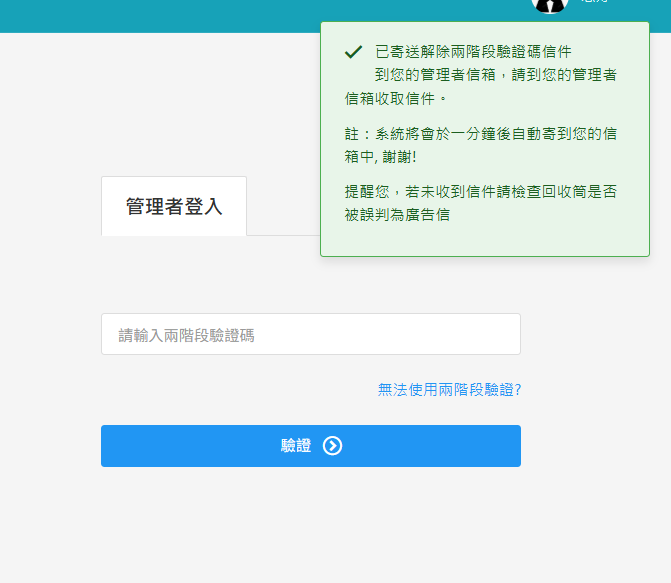 解除兩階段驗證後,您的帳號安全性會暫時降低。請在成功登入後立即重新設定新的兩階段驗證,以確保帳號持續受到保護。